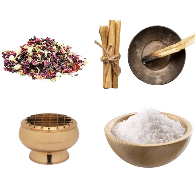 This bundle consists of energised space-clearing products like dried energy cleaning sage leaves, Palo Santo sticks and Arabian Sea Salt.
