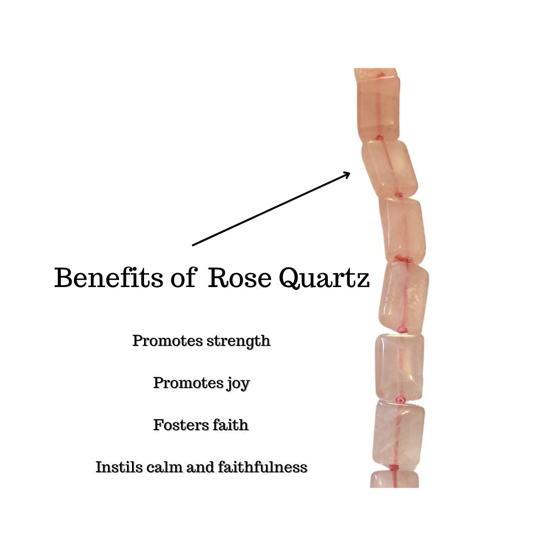 The Rose Quartz crystal gemstone necklace primarily promotes and strengthens all types of love, fosters unconditional love, promotes joy, promotes emotional healing, fosters faith, strengthens hope, helps overcome despair, instils calm and peacefulness. stimulates sensual imagination.